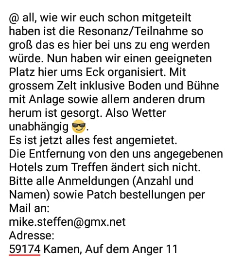 Der Veranstalter darf auch gerne Präsenz hier zeigen. Vllt Fotos und Text zum Treffen placieren? Ich denke nicht jeder mag Facebook. Gibt es eine WhatsApp Gruppe zum Treffen? Ein Direktlink zur jetzigen Infoseite sollte hier auch hinein.
