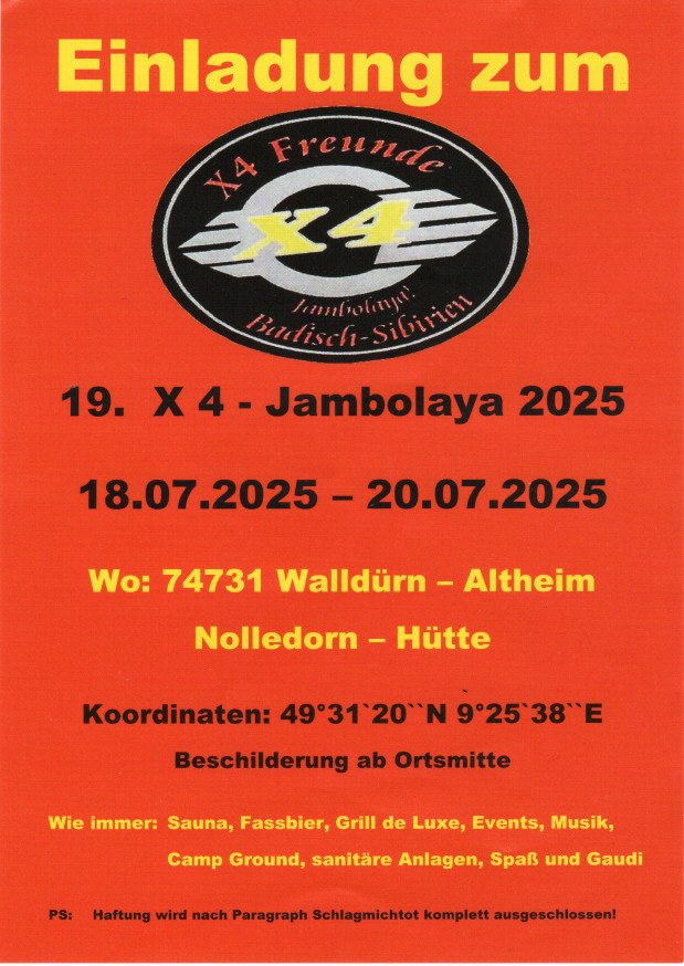 Wir laden euch ein zum 19. Conty´s X Treffen Jambolaya in 74731 Walldürn-Altheim, Noledornhütte vom 18. bis 20.07.2025. Für Speis und Trank ist gesorgt, am Samstag wird es bei gutem Wetter auch eine Ausfahrt geben!