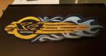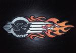 Hier auf jeden Fall noch ein letztes Stück das meine Werner Puppe in einer Vitrine in Händen hielt. Farben : dunkel Blau der Hintergrund, hell Blau die Flames, Gold - Gelb das x4 Logo auf die Flames gestickt. Größe ca. 31 cm lang, Höhe ca. 11 cm.